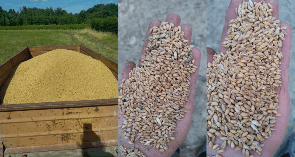 Qui dit récolte dit stockage, qui dit stockage dit tri pour éliminer les impuretés et garantir un stockage sain. Il y a un premier passage en trieur-séparateur (une machine qui vibre !!) et un deuxième avant de moudre le blé. Sur les images vous pouvez voir avant/après le premier tri !